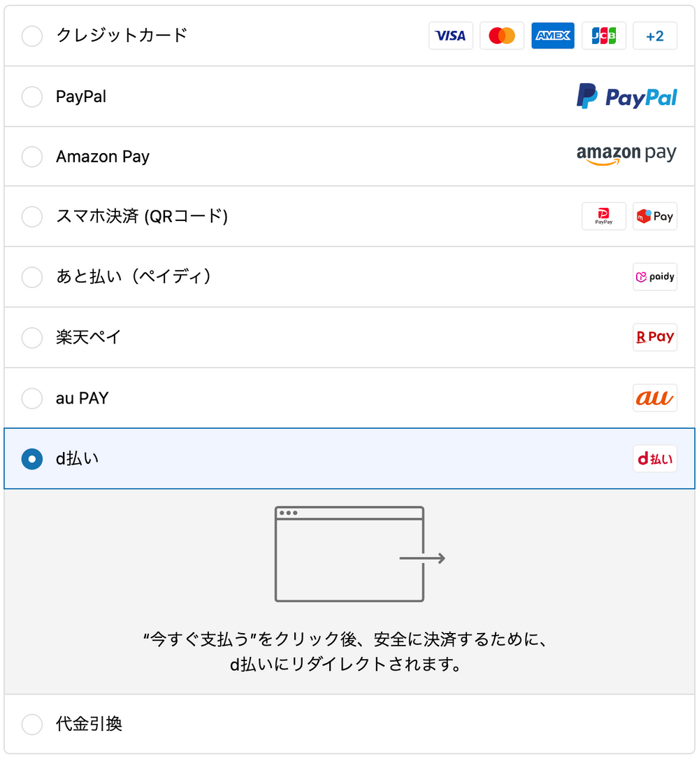 d払いのアプリまたはサイトに移動し、d払いを利用して簡単にお支払いいただく決済方法です。※お支払い時、d払い残高不足にてお支払いが行われなかった場合、カートから再度お支払い手続きをお願いいたします。