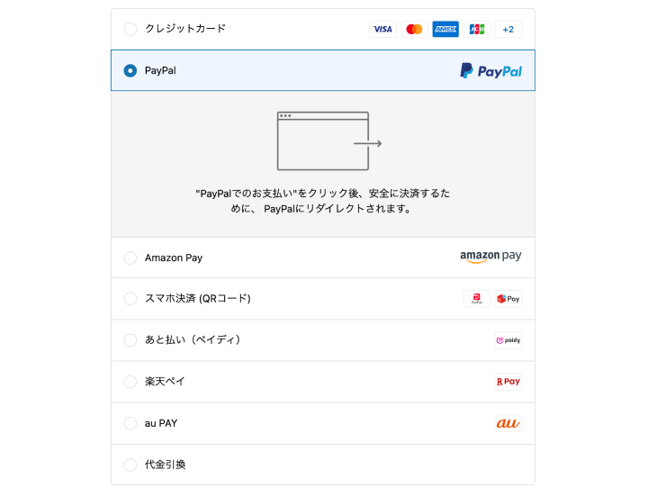 「PayPal」を選択してください。その後、PayPalのログイン画面が表示されますので、登録されているアカウント(メール又はID)でログインし、決済を完了ください。