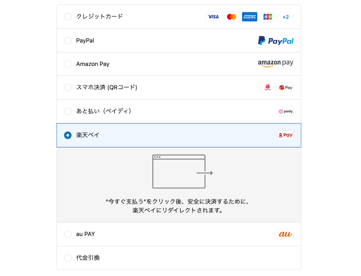チェックアウト画面で、「楽天ペイ」を選択します。楽天ペイは、楽天ポイントも使える便利な決済方法です。